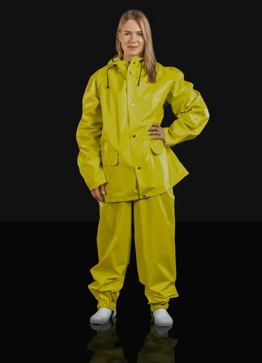Retro with cotton fabric back, weight 400g/m2. Water column 17000, cold resistant with semi-matt surface. Welded seams. Note: The material is from some of the last few remaining retro-rollers in the warehouse of a world-leading manufacturer, which makes each rain suit completely unique and cannot be recreated!