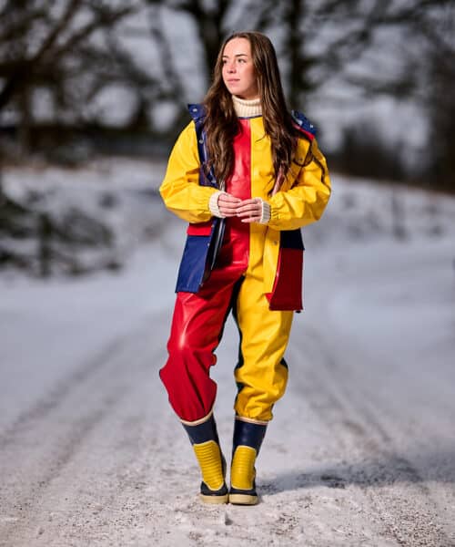 Retro with cotton fabric back, weight 400g/m2. Water column 17000, cold resistant with semi-matt surface. Welded seams. Note: The material is from some of the last few remaining retro-rollers in the warehouse of a world-leading manufacturer, which makes each rain suit completely unique and cannot be recreated!